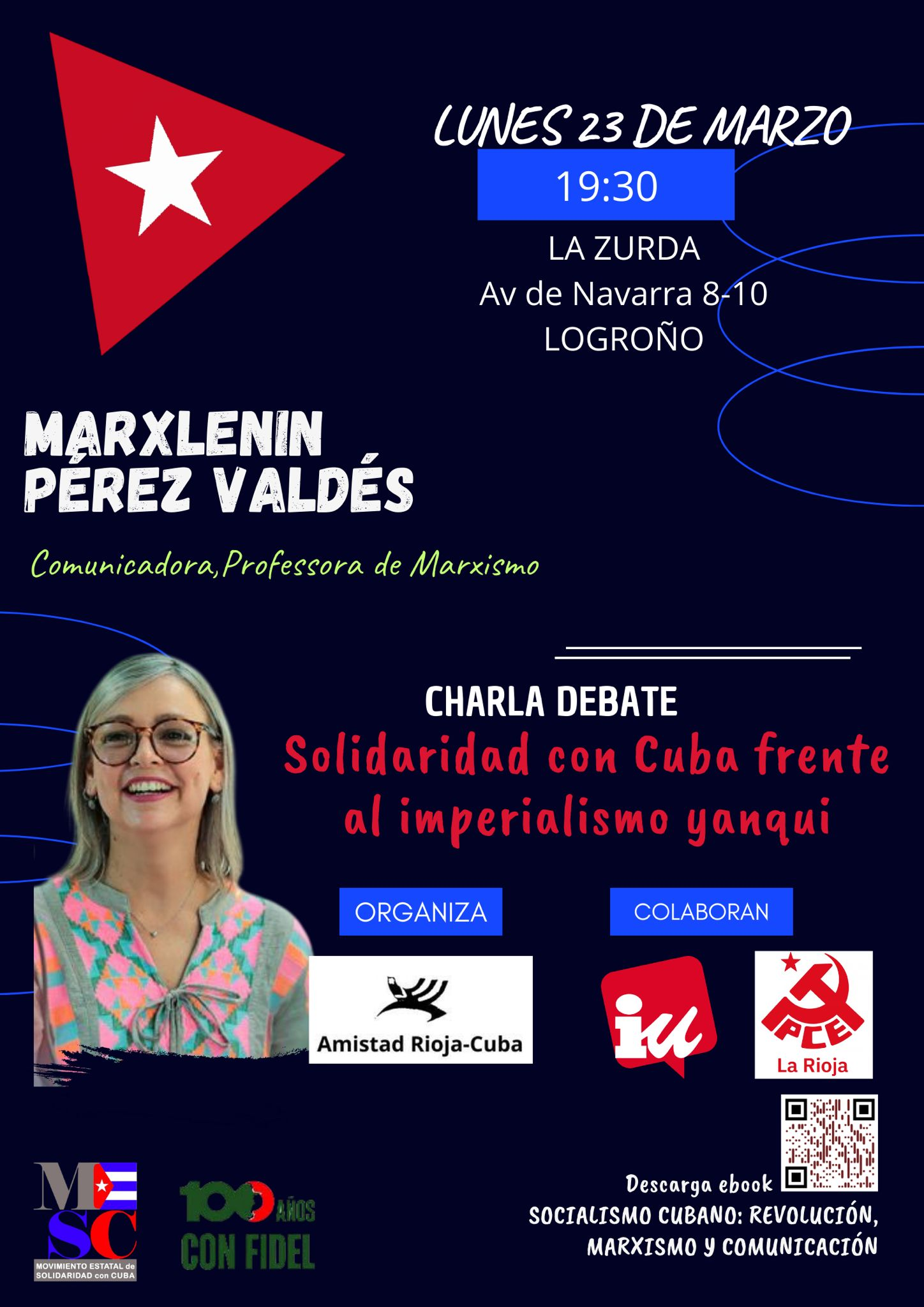 La organización Amistad Rioja-Cuba organiza este lunes 23 de marzo a las 19:30 una charla debate centrada en la cuestión de hacer efectiva la solidaridad con Cuba bajo el bloqueo imperialista y criminal impuesto por Estados Unidos.